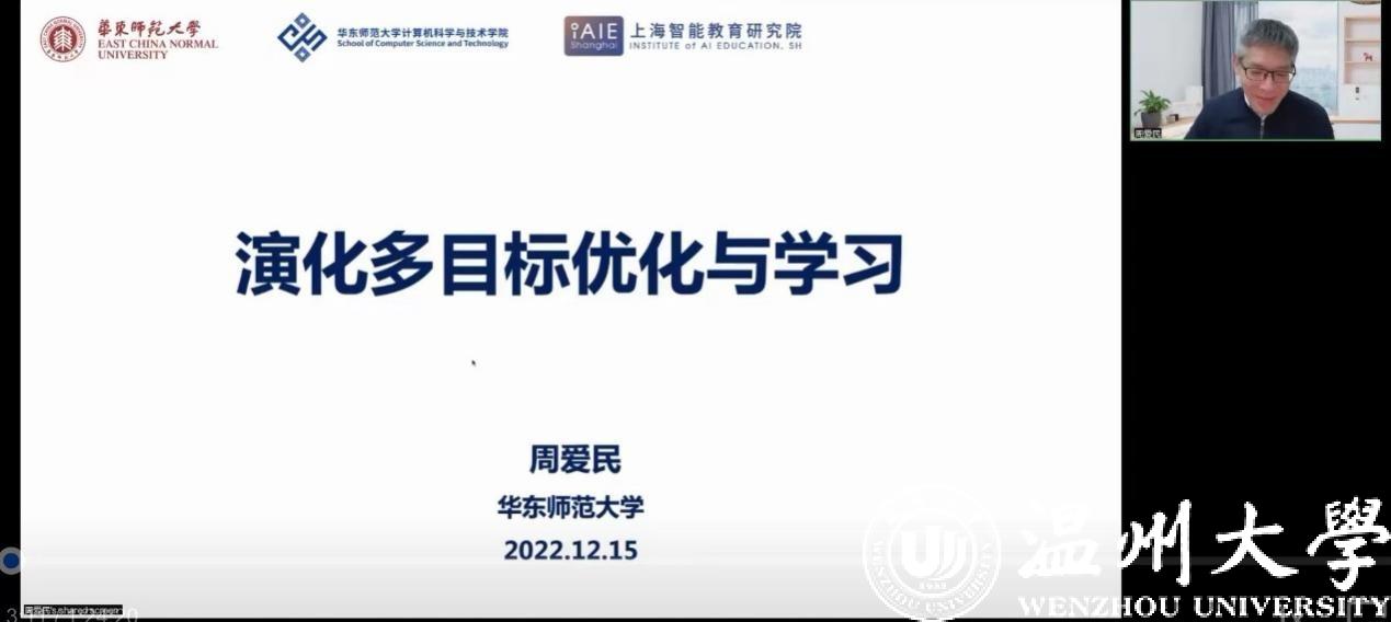 2022年12月15日,华东师范大学计算机科学与技术六合彩网站 周爱民教授受六合彩网站 邀请作题为“演化多目标优化与学习”的学术沙龙讲座。讲座由副院长陈慧灵主持,60余位相关领域人员参会。因疫情防控需要,本次讲座以线上形式进行。