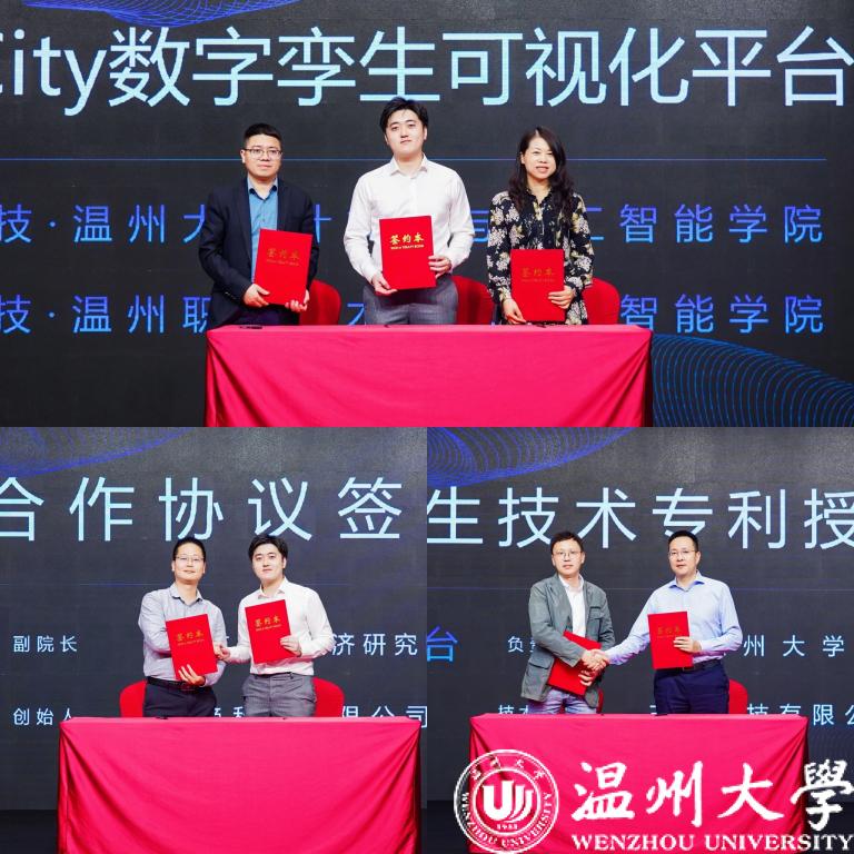 签约仪式上,温州市数字经济研究院与三缔科技有限公司签署了战略合作协议,并进行了温州市数字孪生专委会专家聘任仪式。三缔科技有限公司与温州大学签署数字孪生技术专利授权,以及与两大院校签署了StarCity数字孪生可视化平台捐赠协议。