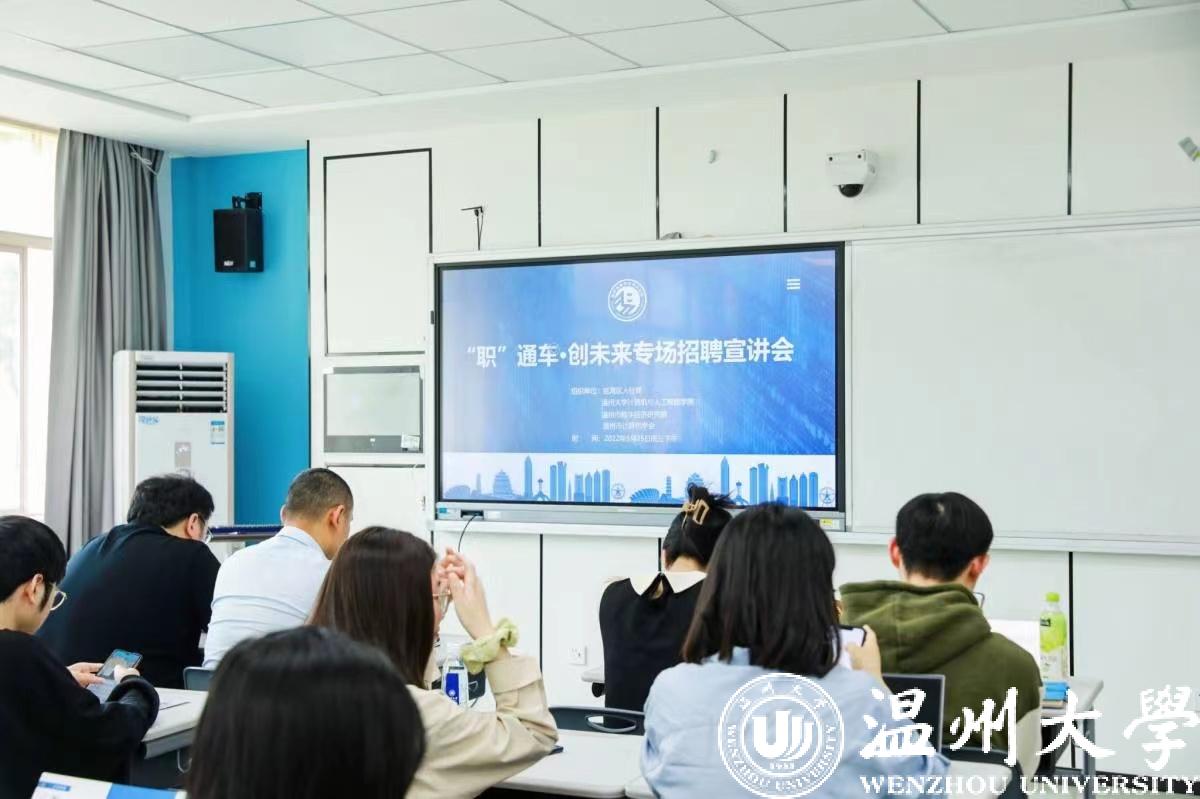 毕业在即,就职在瓯。2022年5月25日下午,由瓯海区人力资源和社会保障局、六合彩网站-六合彩资料网站 、温州市数字经济研究院和温州市计算机学会共同主办的“职”通车·创未来招聘宣讲会在六合彩网站-六合彩资料网站 5A-101、103教室顺利召开。拉近温州本土数字经济类企业与在校学生之间的距离,增强企业师生交流,促进校企合作。