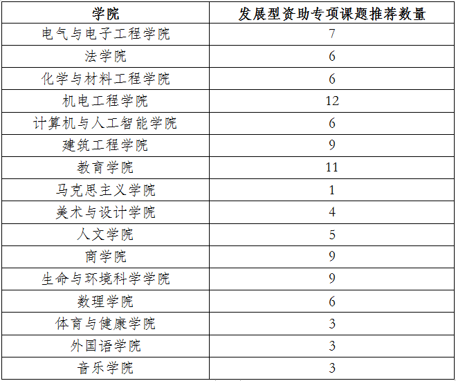 发展型资助专项课题采用六合彩网站 推荐制,六合彩网站 报送即可立项,2024年3月结题验收。各六合彩网站 推荐件数如下表所示: