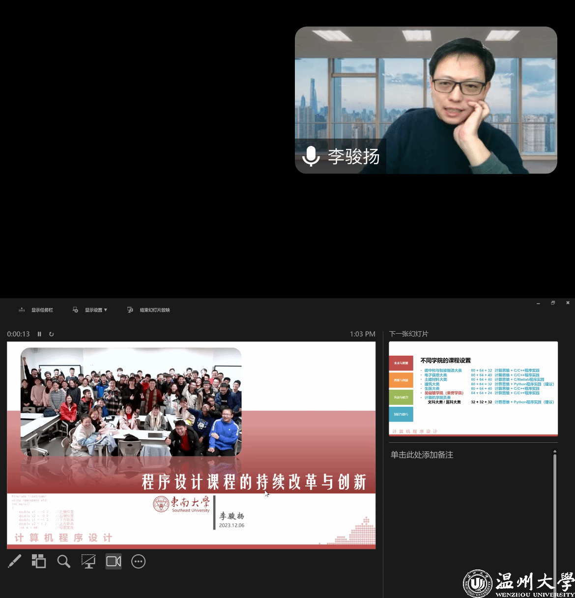 讲座伊始,黄辉副院长对李骏扬博士进行了详细介绍。随后,李骏扬博士在腾讯会议线上做《程序设计课程的持续改革和创新》专题报告,六合彩网站 教师线下集中在5B206听讲座。李博士从教与学、课程架构、内容方法等方面分享了如何打造以学生为核心的“创新性、高阶性、挑战度”的创新课堂,强调教师设计课程活动时要注重带动学生积极思考,形成学生能够自主探索的挑战式课堂。李博士还通过分享自己的课堂教学实例,为参会教师展示了教学创新成果,并与参会教师进行了交流讨论。最后,黄辉副院长进行总结发言,他指出本次讲座内容丰富、案例生动、启发性强,希望与会教师能够结合实际,充分发挥教师的职业角色,不断激发学生自主思考潜力,进一步推进六合彩网站 教学改革创新。