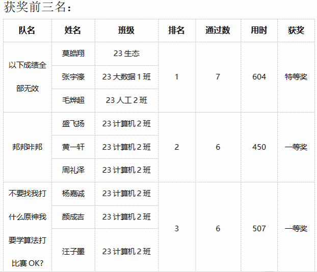 比赛现场战况焦灼,气氛热火朝天,参赛者认真思考,互帮互助,一双双神采奕奕的眼睛注视屏幕,键盘敲击声犹如打开计算机世界的大门。队员们于题海之中运筹帷幄,代码在屏幕上跃动,气球昭示着队友们的荣誉。首次通过一题的队伍由ACM老队员命题人亲自送上金色气球,这种首创做法更是吸引着大批人挑战还没有人通过的难题。经历了三个半小时的鏖战,共角逐出1支特等奖队伍,1支最佳女队,10支一等奖队伍,22支二等奖以及33支三等奖队伍。其中,由23生态莫皓翔、23大数据1班张宇濠和23人工2班毛烨超组成的“以下成绩全部无效”队荣获特等奖;由23电气1班金文清、23电气2班罗芷怡和23电气3班张涵组成的“萝萝山小分队”队获得“最佳女队”称号。获奖最多的是计算机专业:23计算机1班48人参赛,40人获奖;23计算机2班47人参赛,40人获奖,约占获奖队伍40%。