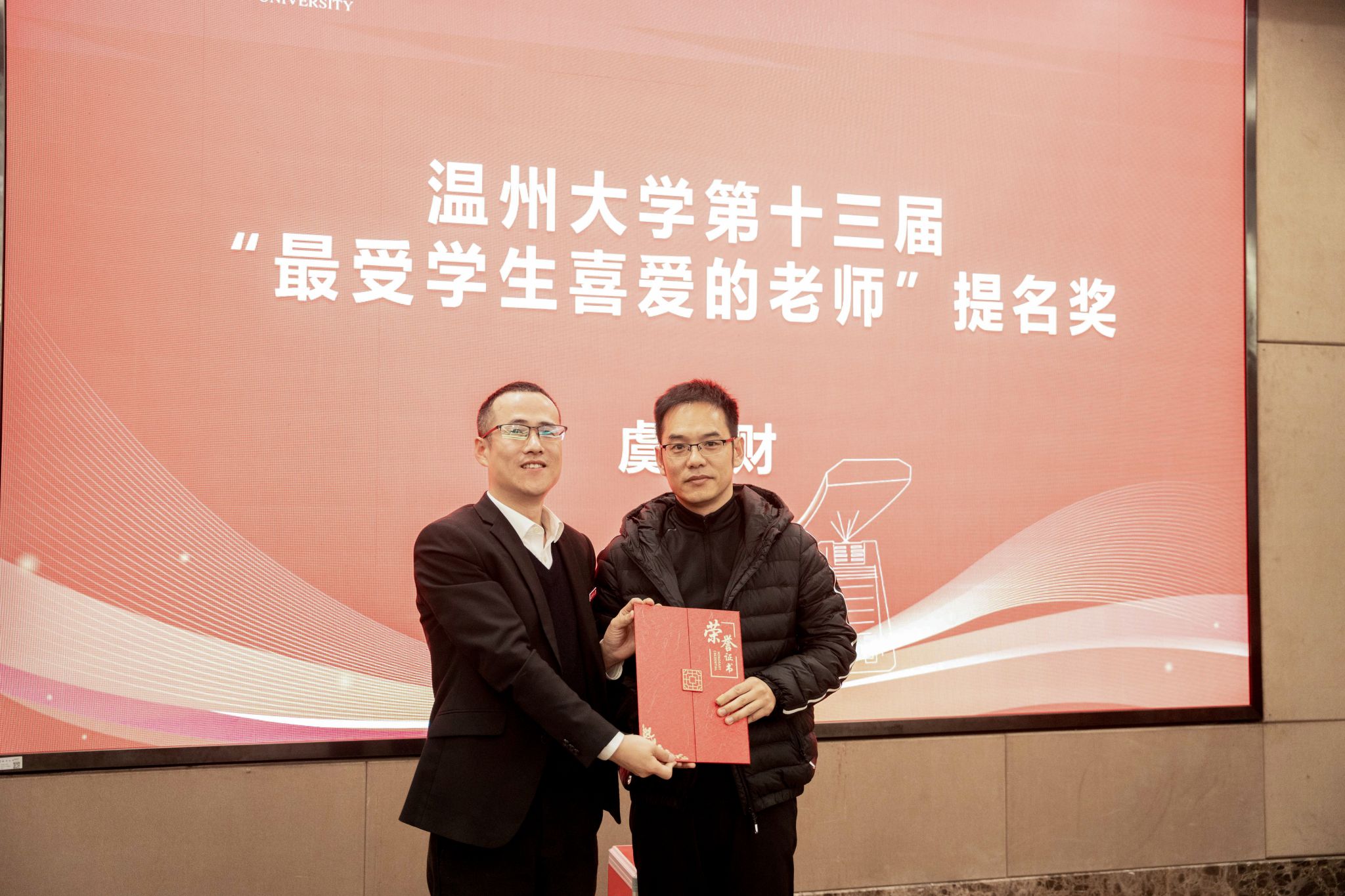最后,陈慧灵副院长向虞铭财教师颁发温州大学第十三届“最受学生喜爱的老师”提名奖荣誉证书。全力书记、陈慧灵副院长、黄辉副院长向陈伟斌、金可仲、李忠月和虞铭财四位教师颁发六合彩网站-六合彩资料网站 “最受学生喜爱的老师”荣誉证书。