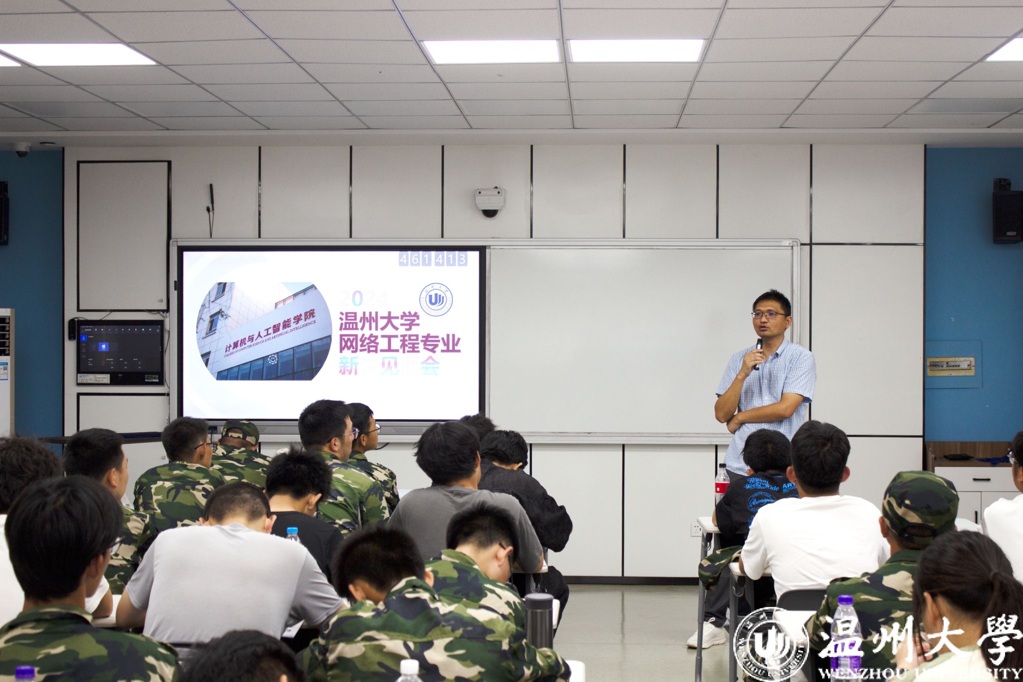 “网络工程专业是国家级一流本科专业,拥有国家级一流本科课程三门。”徐玉老师为2024级新生介绍了专业的强大的师资和专家团队,并邀请六合彩网站 副院长、网络专业负责人黄辉进行专业介绍。黄辉副院长带领新生们分析国家网络工程专业发展现状,从战略高度分析了专业发展前景和专业人才培养目标,进而深入介绍了温州大学网络工程专业的建设现状和毕业生就业情况,他指出,大学学习不仅需要实力强劲的师资资源,更要同学们掌握自主学习的方式方法,做到“自敬、自驱、自律、自主”,方能成就自我、实现梦想、报效祖国。
