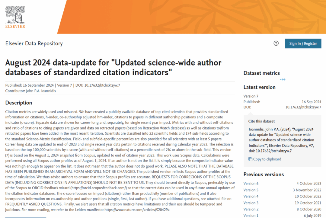 全球前2%顶尖科学家榜单是基于Scopus数据库的引用数据系统分析,使用总引用量、Hirsch H-index、共同作者修正的Schreiber Hm-index、单独作者、单独或者第一作者等6个关键因素评分,从全球近700万名科学家中遴选出世界排名前2%的科学家,涵盖了22个领域和174个子领域,为科学家长期科研表现提供了一个衡量指标,能够更客观、更真实地反映科学家的影响力。其中生涯科学影响力榜单(Career)统计科学家职业生涯期间的综合表现,而年度科学影响力榜单(Singleyr)则更聚焦上一年度的学术影响力。