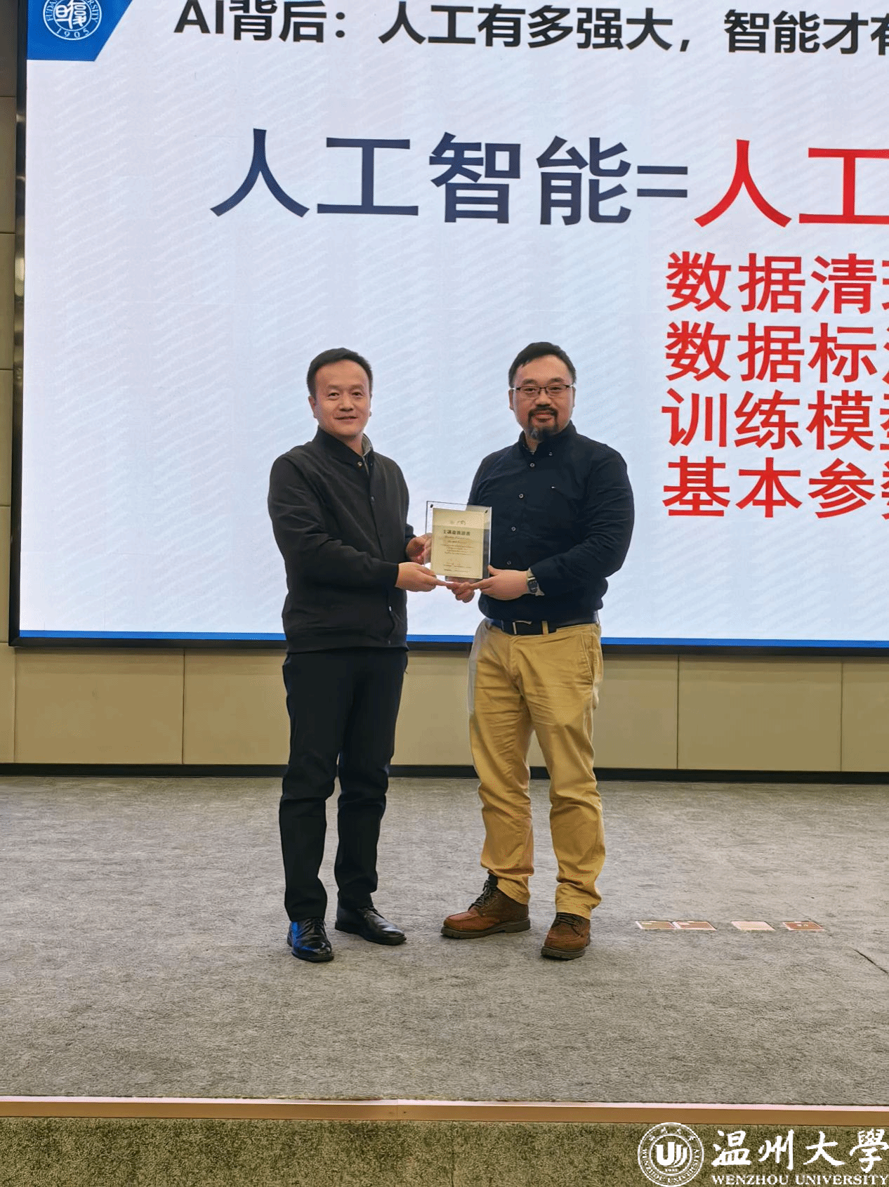 最后,温州大学图书馆副馆长周志峰为徐书华教授颁发了“罗山讲堂主讲嘉宾”荣誉证书。讲座在热烈的掌声中落下帷幕,师生们纷纷表示,此次讲座不仅使师生们对人工智能和基因大数据有了更加深入的了解,也为大家未来的学业发展和职业规划提供了宝贵的指导。