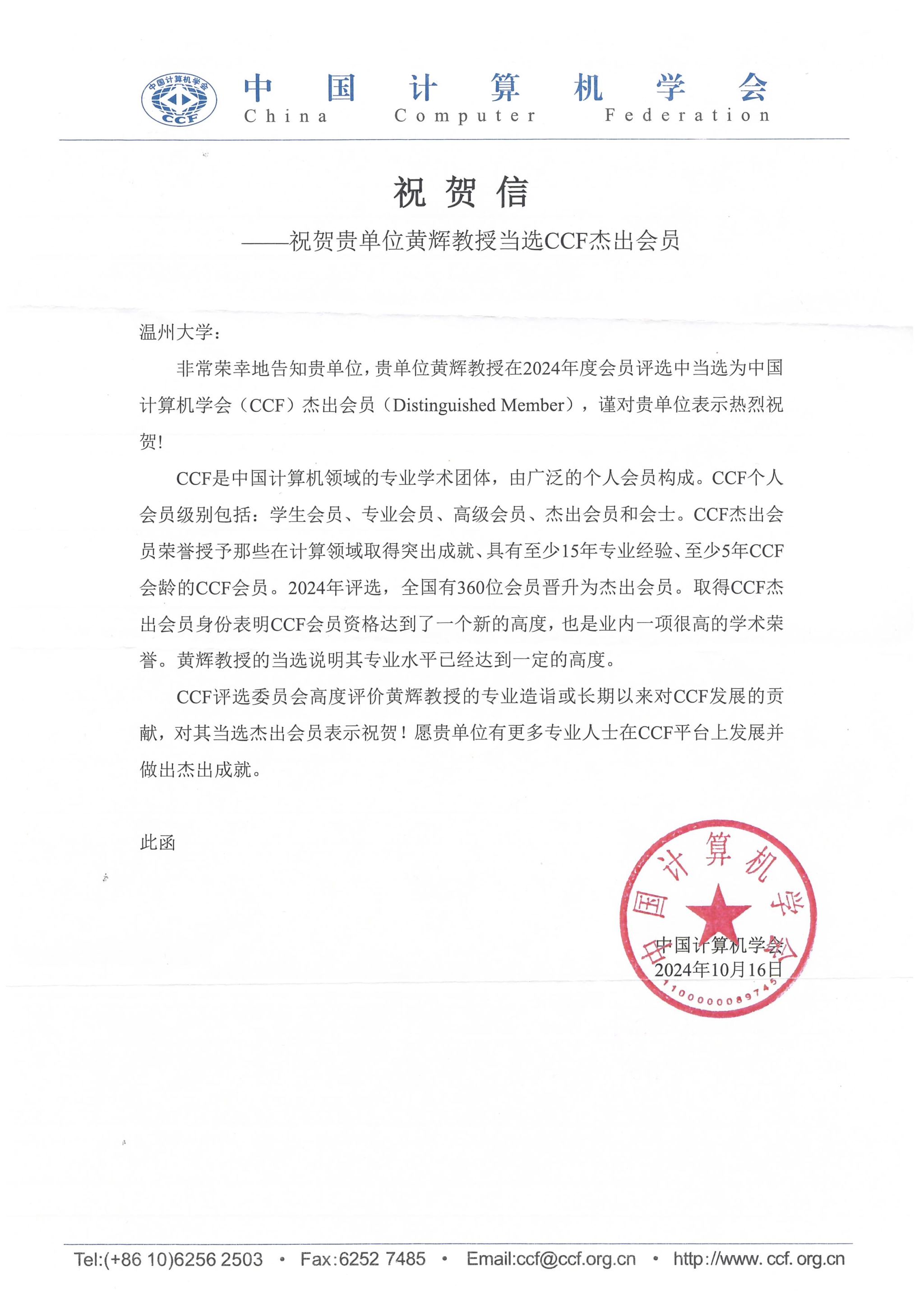 近日,中国计算机学会(CCF)发来贺信,祝贺六合彩网站 黄辉教授当选中国计算机学会(CCF)杰出会员(Distinguished Member)。