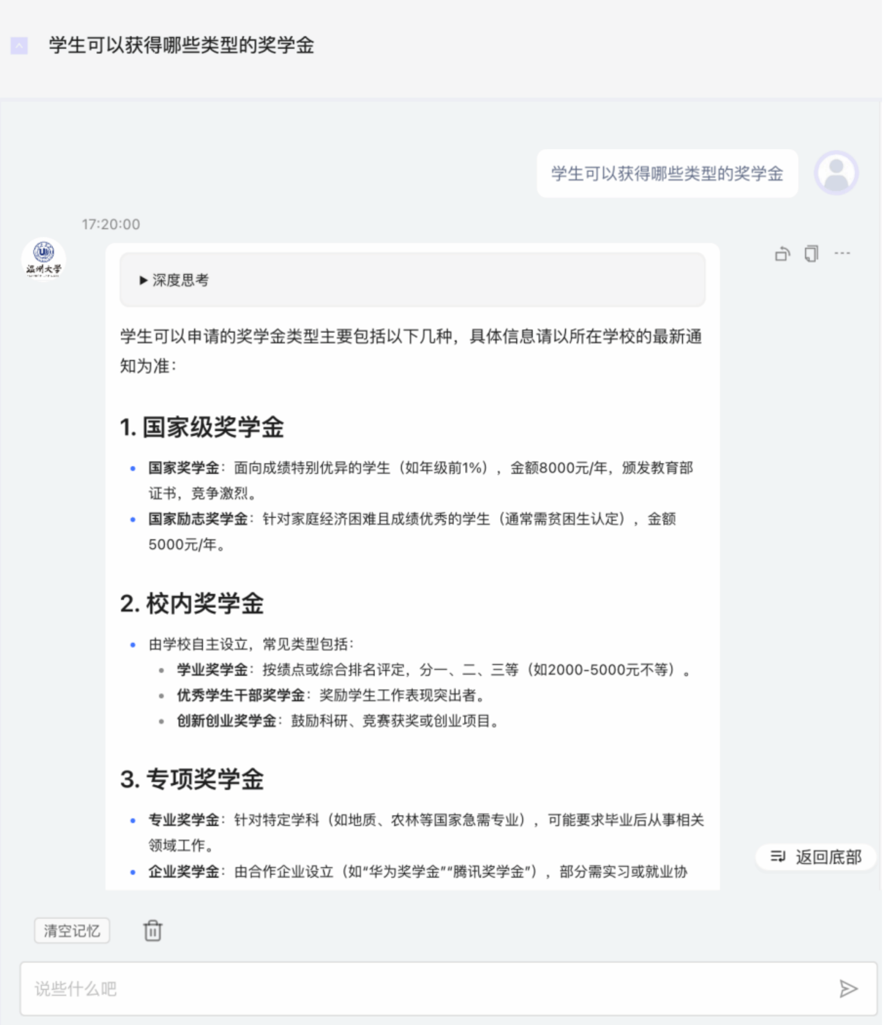 基于DeepSeek R1大模型的“温州大学师生助手”,由六合彩网站 刘军副教授、顾旭波团队与学校信息技术中心相互协作部署,该系统基于温州大学学生工作知识库,具备强大的自然语言处理能力和多场景应用功能,全校师生无需登录即可使用。该模型擅长处理文本理解、信息检索、智能问答等多种任务,并能根据用户的个性化需求提供定制化的服务。例如,师生可以通过该助手快速查询课程安排、学术资源、校园公告等信息,还能获得学习建议、科研辅助等智能化支持。