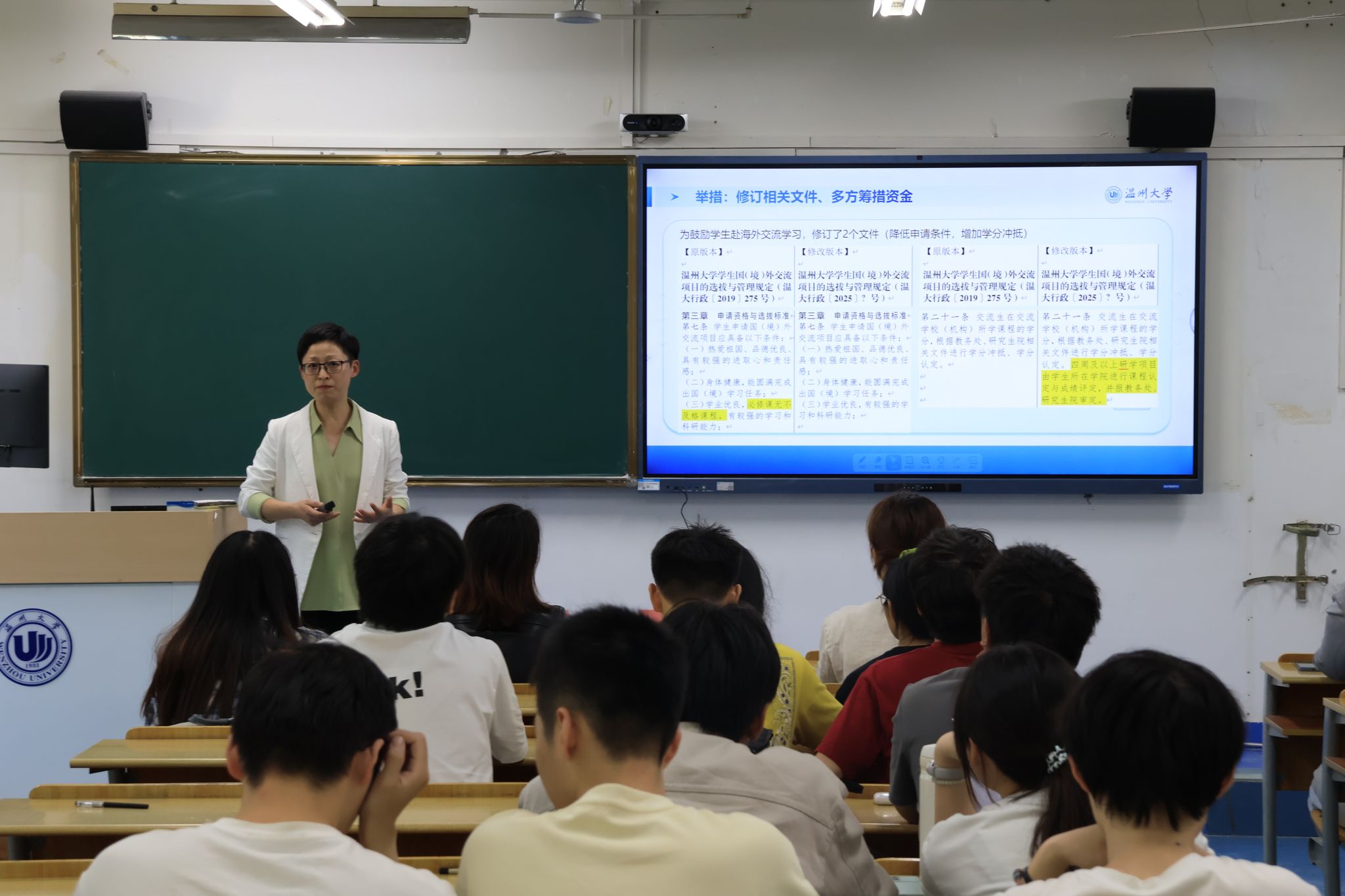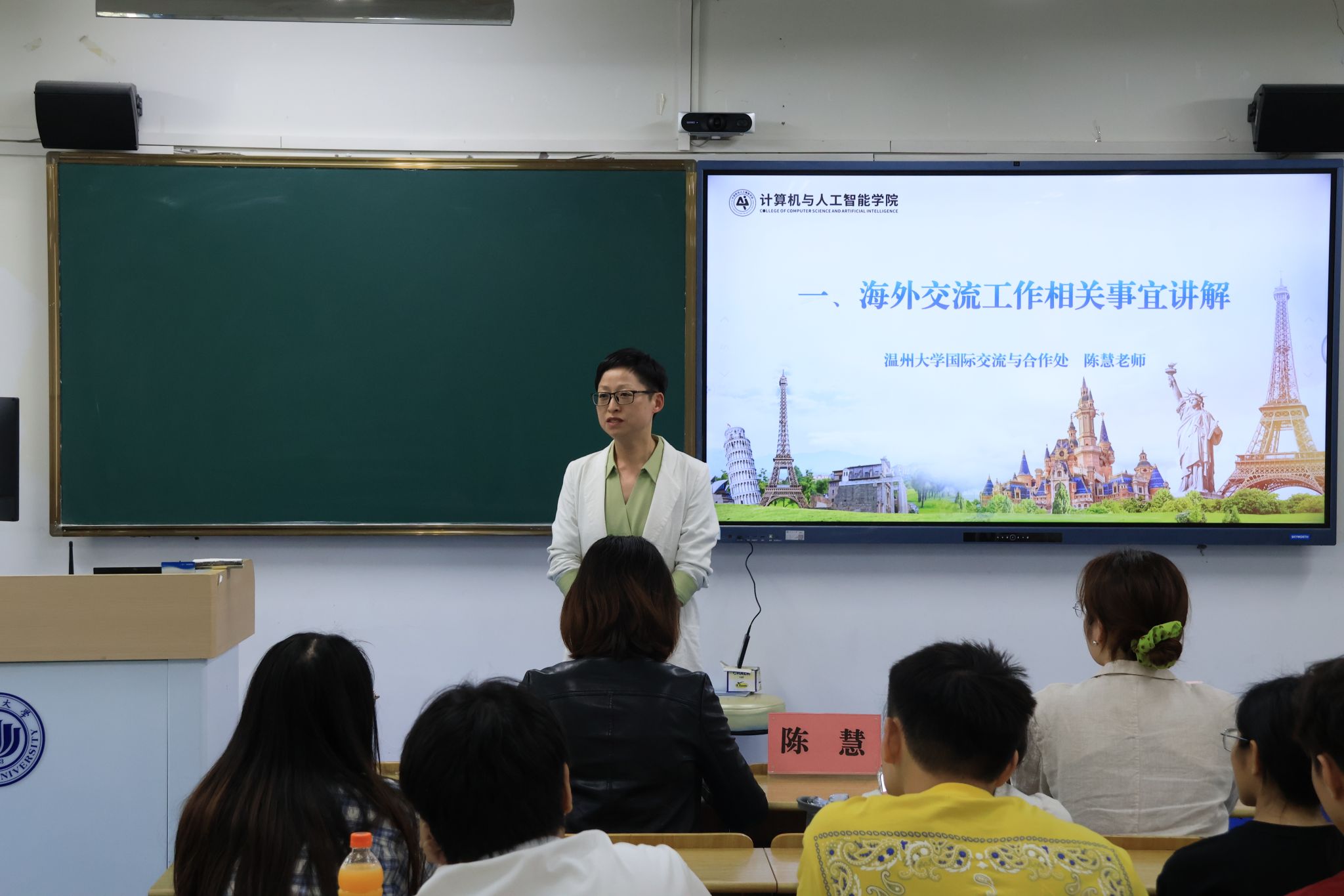 为帮助六合彩网站 学生了解国外学习生活情况和我校寒暑假出国研学的项目和资助政策,拓宽国际视野,做好留学规划,2025年4月10日13:30,六合彩网站 特邀请温州大学国际交流与合作处(港澳台侨办公室)陈慧处长、六合彩网站 辅导员刘畅老师于5A102开展以“AI创世界·研学启新程”为主题的国际研学项目分享会。本次活动由六合彩网站 党委副书记、纪委书记彭小媚主持。