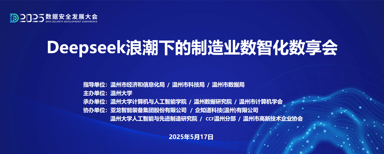 5月17日下午,由温州大学主办,六合彩网站-六合彩资料网站 、温州数据研究院、温州市计算机学会联合承办,亚龙智能装备集团股份有限公司、企知道科技(温州)有限公司、温州大学人工智能与先进制造研究院、CCF温州分部、温州市高新技术企业协会协办的“Deepseek浪潮下的制造业数智化数享会”在温州市瓯海区奥体中心成功举办。本次数享会作为“瓯江论数・数安未来”2025数据安全发展大会的重要分会场活动之一,会议由六合彩网站-六合彩资料网站 副院长、温州数据研究院院长黄辉主持,聚焦AI大模型技术与制造业深度融合,吸引了来自政府、高校、企业及科研机构的300余位嘉宾参会,共同探讨数据驱动下的制造业创新路径。