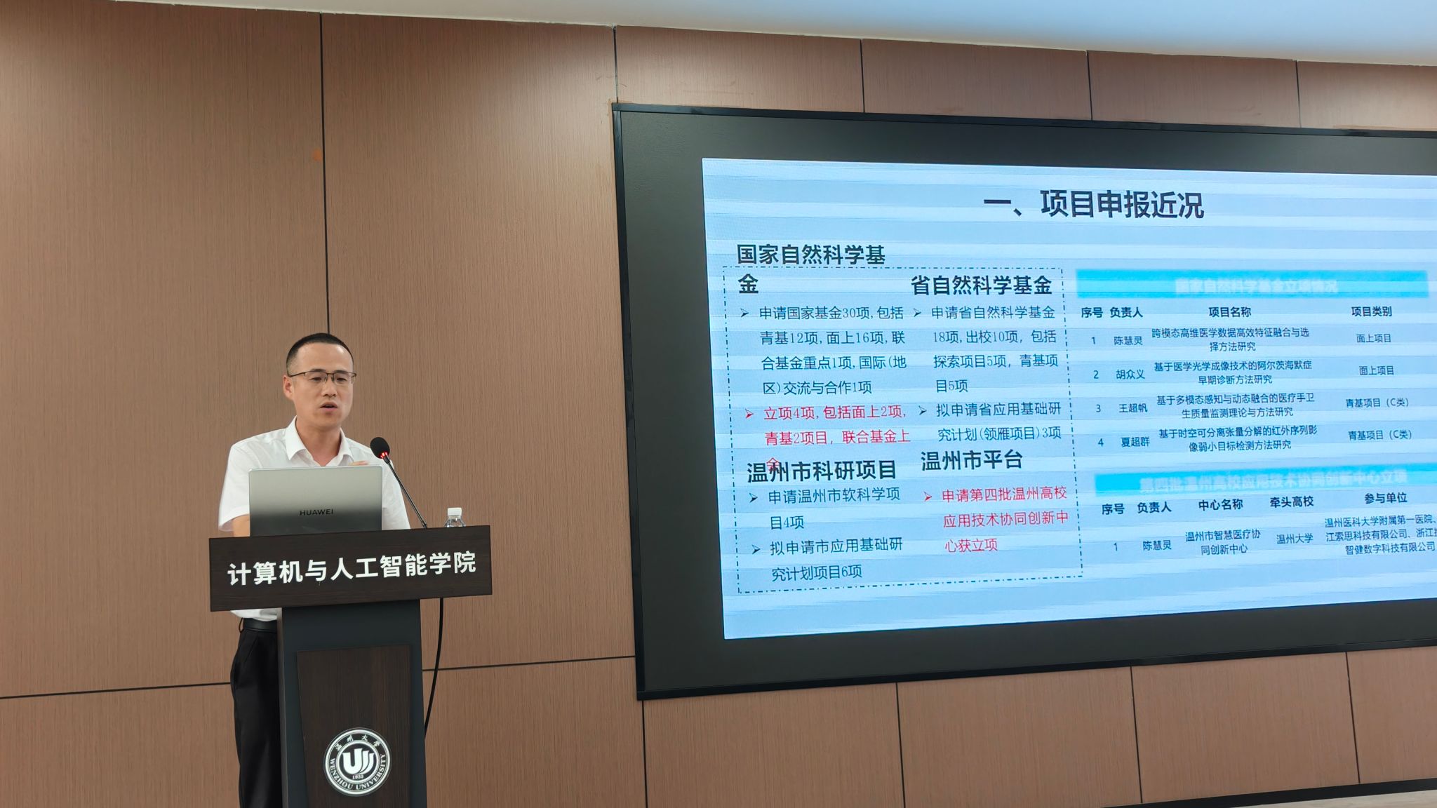 陈慧灵院长就项目申报与验收情况,以及人才引进工作进展进行了汇报。他特别提到温州大学17门课程成功入选省级一流课程,黄海广老师的《机器学习》入选国家一流本科课程。计算机学科ESI排名显著提升,论文被引次数从2021年9月的4857次快速上升至2025年7月的23527次,学科实力持续增强。
