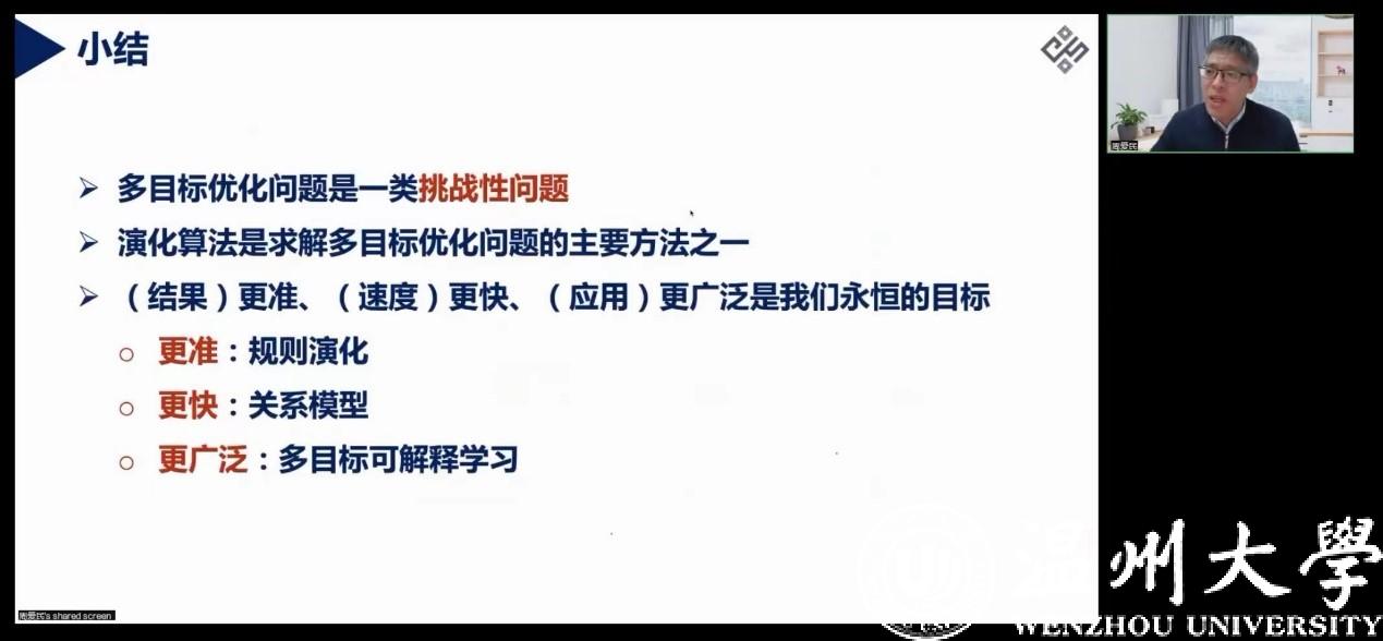 周教授指出,随着当前多目标领域研究逐渐深入,盲目或半盲目搜索遗传算法愈发显示出其不足之处,而基于学习理论的多目标优化将会在该领域显现出优势。他重点介绍了其团队在此方向上取得的最新成果进展,其中包括多目标优化新解产生策略——规则演化、用于求解高代价多目标优化问题的新型代理模型——关系模型以及多目标优化的实际应用——可解释性建模等。随后,周教授对于当前多目标优化领域存在的相关问题进行总结,并对其未来发展方向提出前瞻性建议。