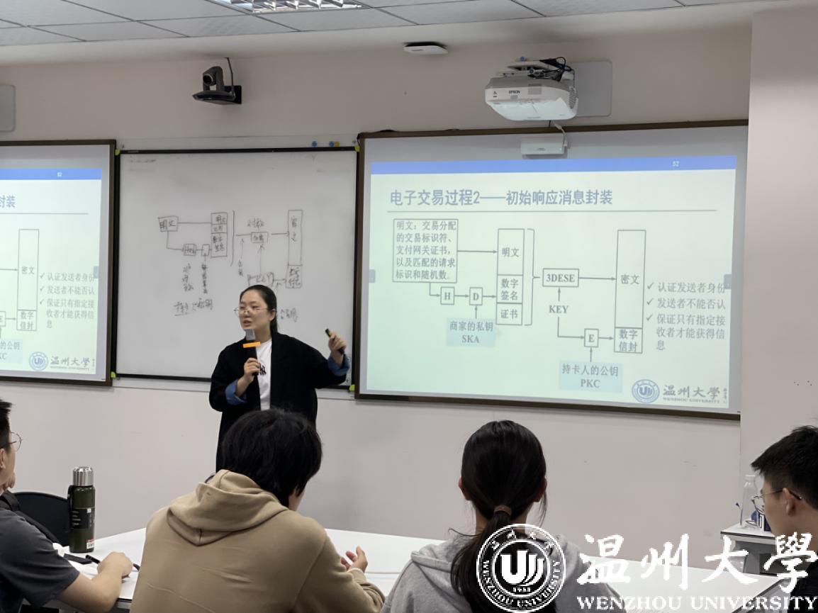 本次课主要讲授了安全电子交易协议SET的协议工作原理。课程从学生熟悉的网上购物场景切入,分析安全电子协议设计的需求和关键要素,再针对每个交互环节设计消息的封装和拆封认证过程。课程讲述过程中,融入了法规、辩证思维等思政元素。课后,参加观摩的老师在5B301进行了集体研讨,励龙昌老师主持研讨,听课老师就自己听课的认识、看法、见解轮流发言。与会老师一致认为,徐嬴颖老师的这堂示范课教学内容丰富,课堂气氛活跃,课程启发性强,是一堂非常精彩的示范课。