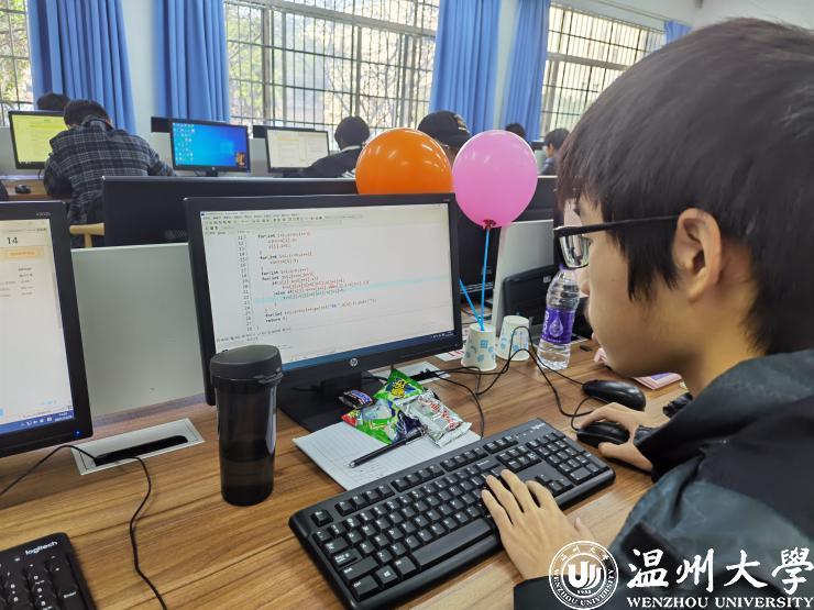 第二个进程为选手比赛,22日下午比赛正式开始。有的同学头脑风暴快速解决问题,有的同学认真细致奋笔疾书力求提高正确率。不久,代表胜利的气球插上了他们的桌角,答对的题数越多气球就越多。新生赛题目是由ACM集训队的命题老师和队员精心设计,涉及字符串处理、排序、游戏模拟、几何计算方方面面,难度梯级分布,展现了参赛者的编程水平和问题解决能力。同学们一路披荆斩“题”,激情不只为那一个个鲜红的AC,更展现了温大学子不怕难不服输的精神。