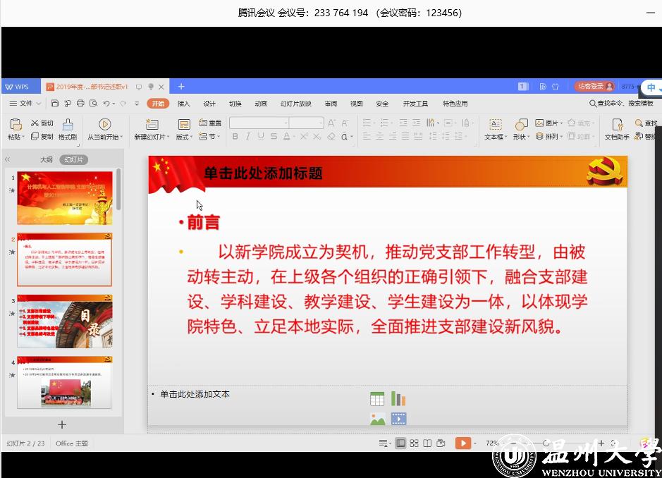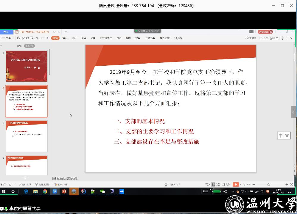 2020年4月14日上午9点,六合彩网站-六合彩资料网站 在腾讯会议上顺利召开2019年度党支部书记工作述职会。六合彩网站 党委委员、学生支部书记、教工支部书记、党务秘书等参加会议。会议由六合彩网站 党委副书记陈志勇主持。