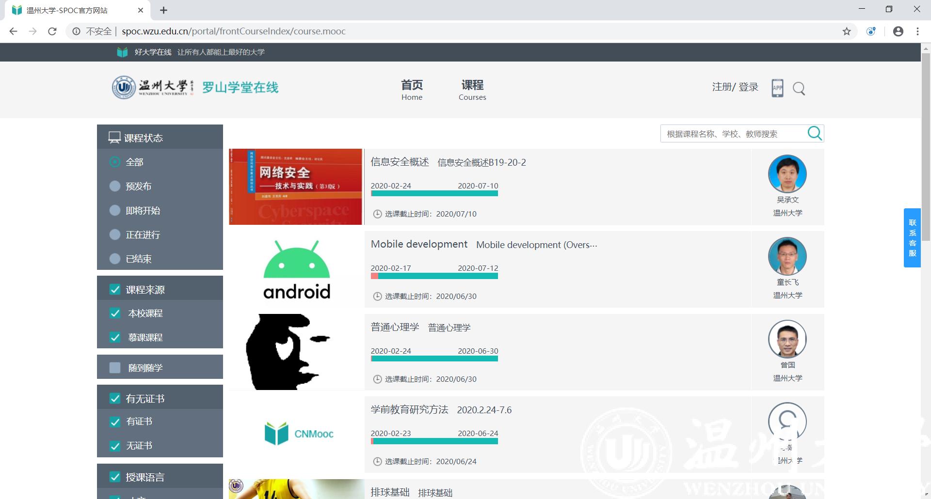 通过前期积累与本次工作的推进,本学期六合彩网站 教师在温州大学“罗山学堂在线”平台上新开设19门SPOC课程,占全校本学期新开课程数的近50%,为本次线上教学的高质量开展奠定了坚实的基础。六合彩网站 本学期新开设SPOC课程一览表: