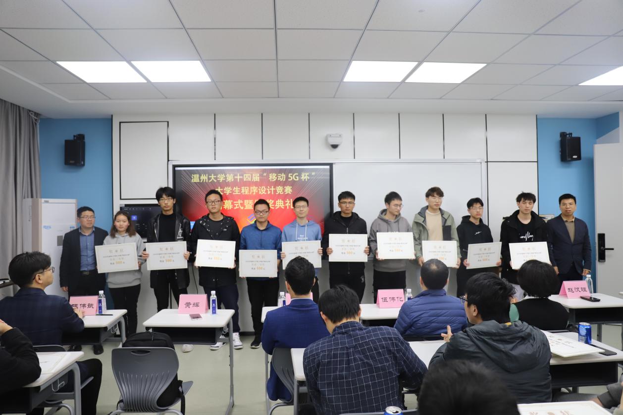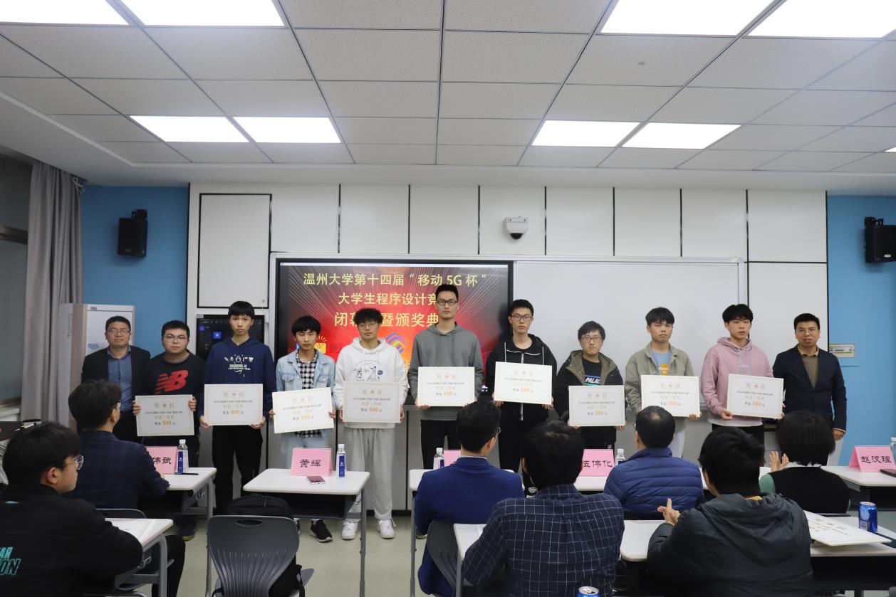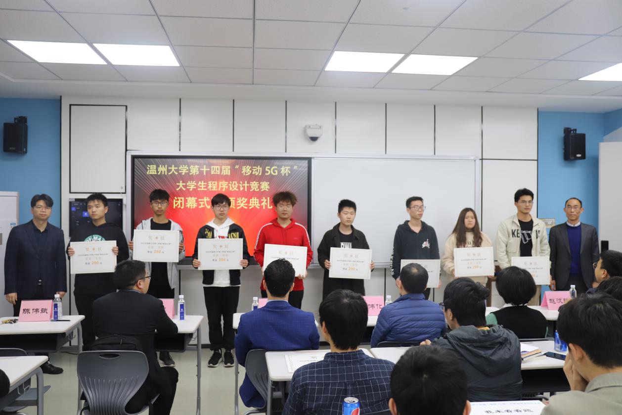 在激烈的比赛结束后,在5A103智慧教室举行了闭幕式暨颁奖典礼。温州移动政企部副总经理伍伟化、温州大学教务处副处长陈小林、计算机六合彩网站 党委书记全力、计算机六合彩网站 副院长黄辉、计算机科学与技术专业负责人赵汉理、计算机科学与技术专业系主任陈伟斌、竞赛负责人胡明晓,以及各个获奖队伍代表参加了此次仪式。典礼伊始,六合彩网站 党委书记全力代表致辞,他介绍了此次活动的目的以及作用,提到了本次竞赛是许多优秀校友迈向IT高级行业的第一步,激励同学们认真训练,在ACM国际大学生程序设计大赛中取得好成绩。