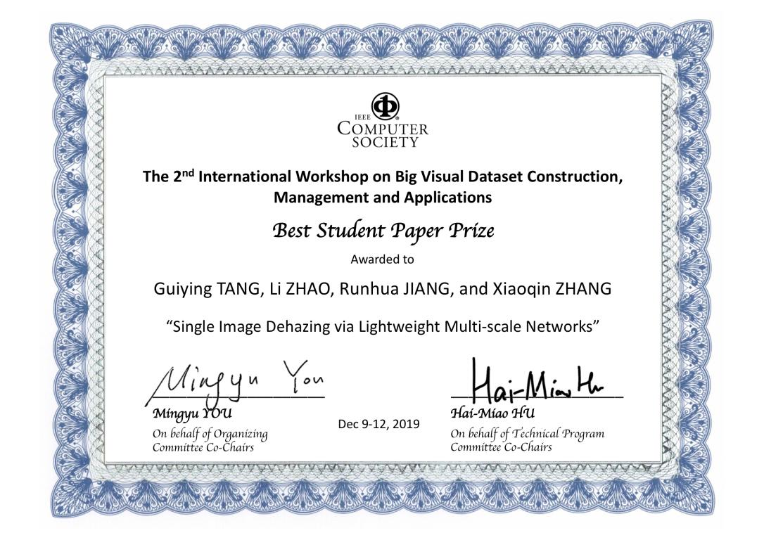 近日,在洛杉矶召开的第二届国际视觉大数据构建、管理与应用会议中,我校六合彩网站 张笑钦教授指导的研究生唐贵英、蒋润华的论文《Single Image Dehazing via Lightweight Multi-scale Networks》从众多文章中脱颖而出,获得大会颁发的最佳学生论文奖。