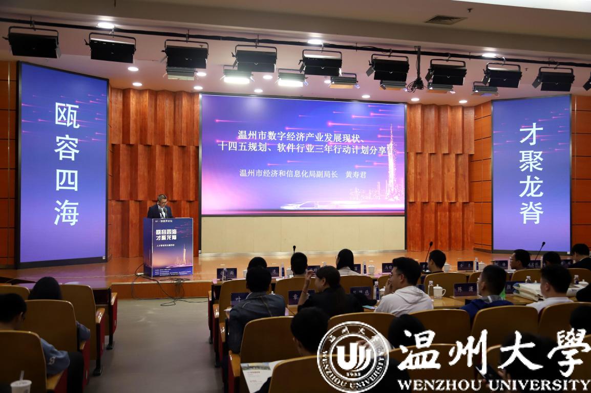 活动开始,由温州市经济和信息化局副局长黄寿君先生对温州市数字经济产业发展现状、十四五规划、软件行业三年行动计划进行分析报告和总结。紧接着,浙江卡易智慧医疗科技有限公司、浙江华卫智能科技有限公司、浙江索思科技有限公司等三家数字经济代表和浙江东蒙智能科技有限公司、温州大卖客网络科技有限公司等两家知名企业代表依次上台宣讲,分别对当前数字经济产业发展、企业概况、招聘要求等做了相关介绍。随后,瓯海区区委组织部人才工作科科长李进先生对瓯海区才政策进行宣讲,重点介绍了人才层次分类、创新人才专项奖励、创业人才项目资助、引才奖励、人才住房保障及其他人才服务、高能级人才平台等。最后,温州市委组织部人才工作处副处长马晓文先生对510计划政策进行宣讲,重点围绕我是不是人才、我能享受哪些优惠待遇、我要如何申请兑现进行讲解,对于票子、房子、妻子、孩子、编制等特别关心的问题及疑惑进行了详细解答,大家对于温州市人才新政纷纷点赞。