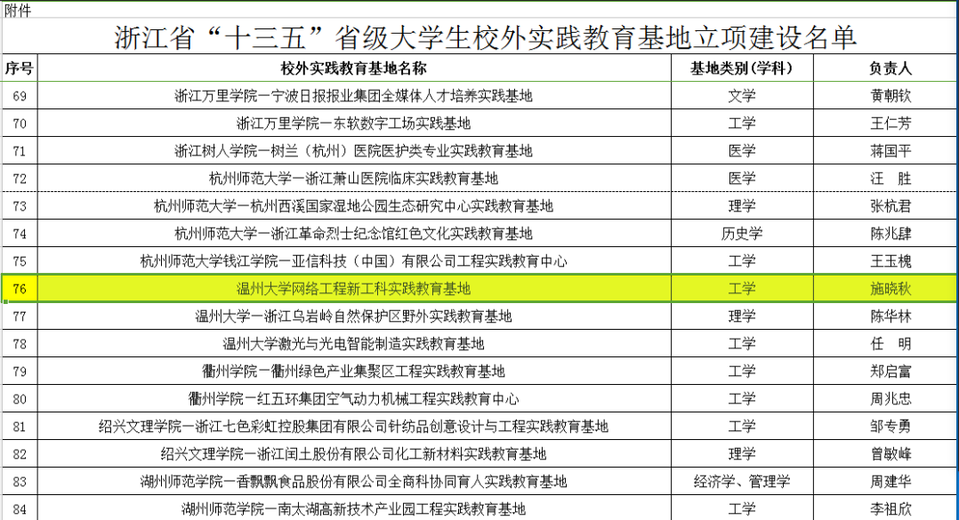 近日,浙江省教育厅办公室公布了119个“十三五”省级大学生校外实践教育基地立项建设名单,六合彩网站 施晓秋教授申报的“温州大学网络工程新工科实践教育基地”获批。其中部分大学生校外实践教育基地名单如下: