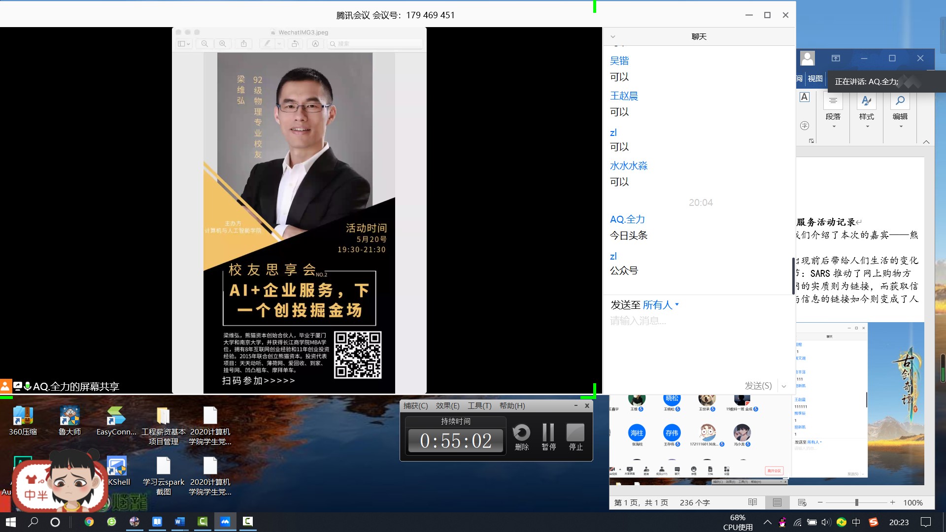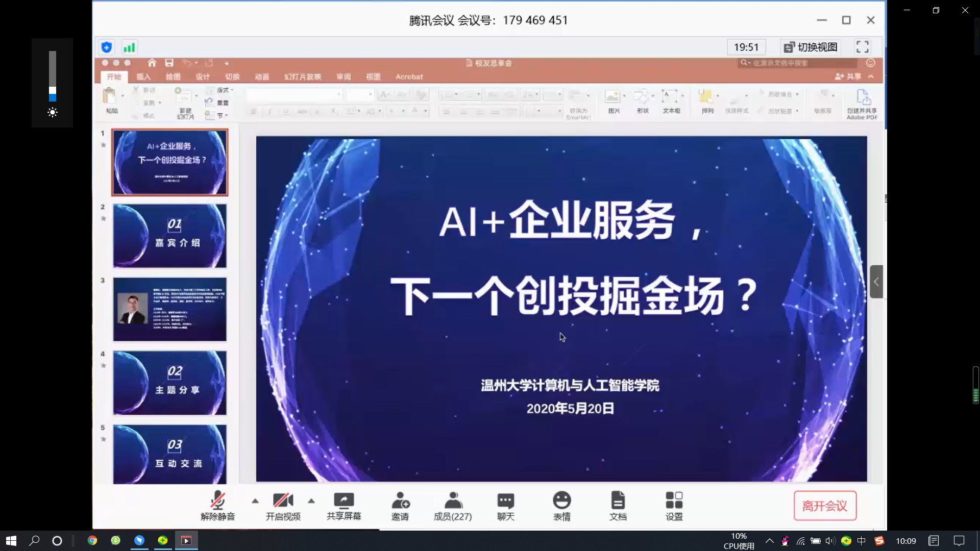 为进一步拓展同学们的眼界,深入了解互联网创业和投资等方面知识,5月20日晚,由温州大学校友发展与联络办公室、六合彩网站 主办的“校友思享会——AI+企业服务,下一个创投掘金场”于腾讯会议上准时开展。本次“校友思享会”由六合彩网站 党委书记全力主持,并有幸邀请到熊猫资本创始合伙人梁维弘为我校300余名师生及校友进行云分享。