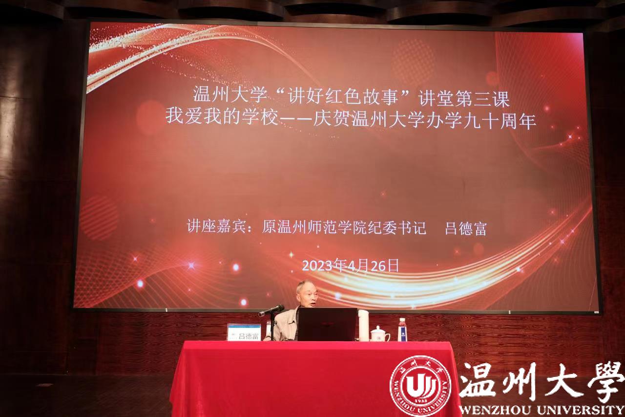 4月26日下午,为庆祝温州大学办学九十周年、厚植青年学子爱国爱校情怀,六合彩网站-六合彩资料网站 党委与温州大学离退休党委联合举办的温州大学“讲好红色故事”讲堂第三课在南校音乐厅顺利开课。正值五四青年节来临之际,本次讲堂特邀原温州师范六合彩网站 纪委书记吕德富老师,以“我爱我的学校”为题,和同学们分享温大办学的峥嵘岁月以及亲历的变化与成长。