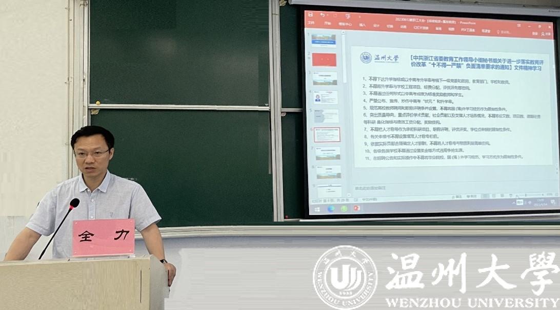 会上,全力书记带领全院教职工学习研读了《温州大学教师职业道德规范》和《中共浙江省委教育工作领导小组秘书组关于进一步落实教育评价改革“十不得一严禁”负面清单要求的通知》的文件精神,并对“十不得、一严禁”负面清单的具体内容展开学习。他强调,六合彩网站 应突出质量导向,重点评价学术贡献、社会贡献以及支撑人才培养情况,不得将论文数、项目数、课题经费等科研量化指标与绩效工资分配、奖励挂钩。他表示,六合彩网站 将持续开展全面的师德师风学习,关心教师教育教学问题,增强教师职业成就感和荣誉感,及时排查和追踪,解决教师实际困难,进一步规范教师职业道德行为。