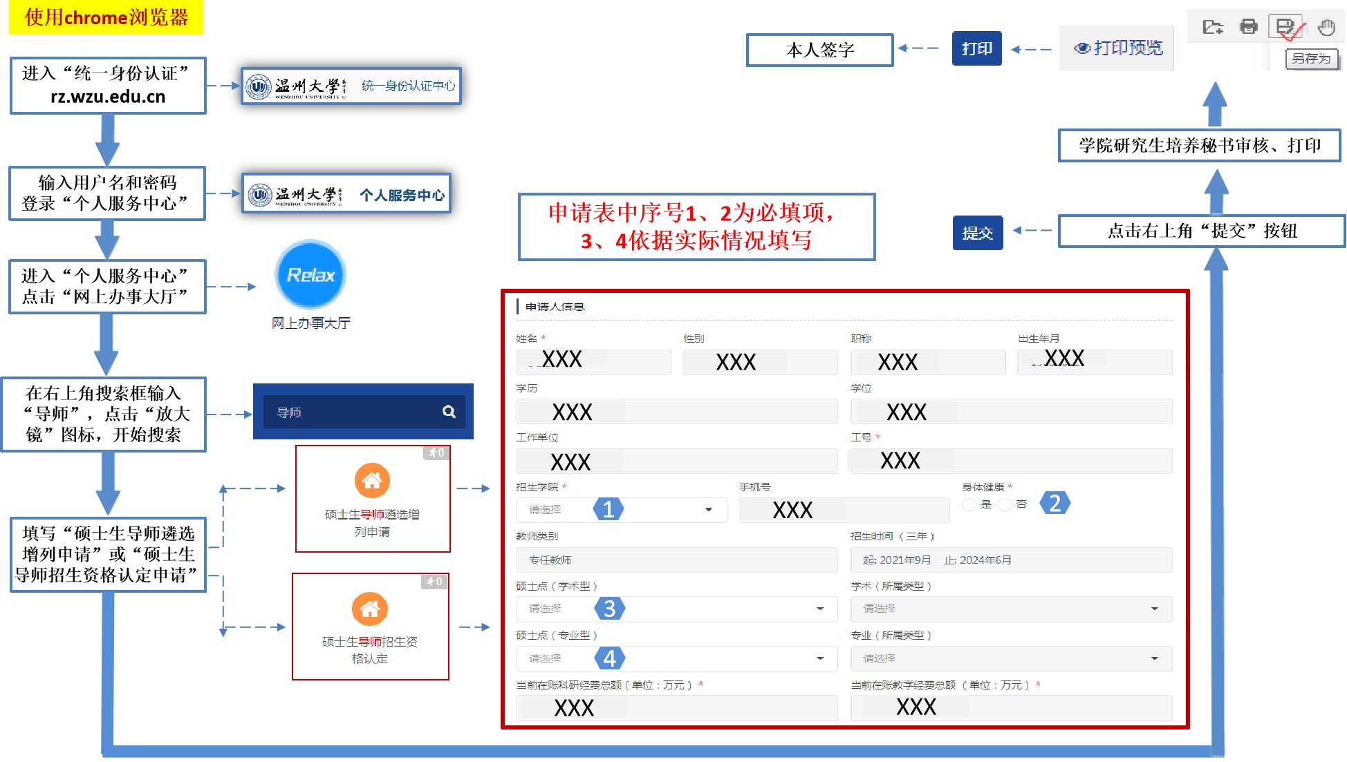 电脑端流程:①进入温州大学官网六合彩网站,点击“统一身份认证”;②登录“个人服务中心”,点击“网上办事大厅”;③进入“网上办事大厅”页面,在右上角输入“导师”搜索;④填写“硕士生导师遴选增列申请”或“硕士生导师招生资格认定”表单,(申请表中(如下图)序号1、2为必填项,3、4依据实际情况填写),点击“提交”。