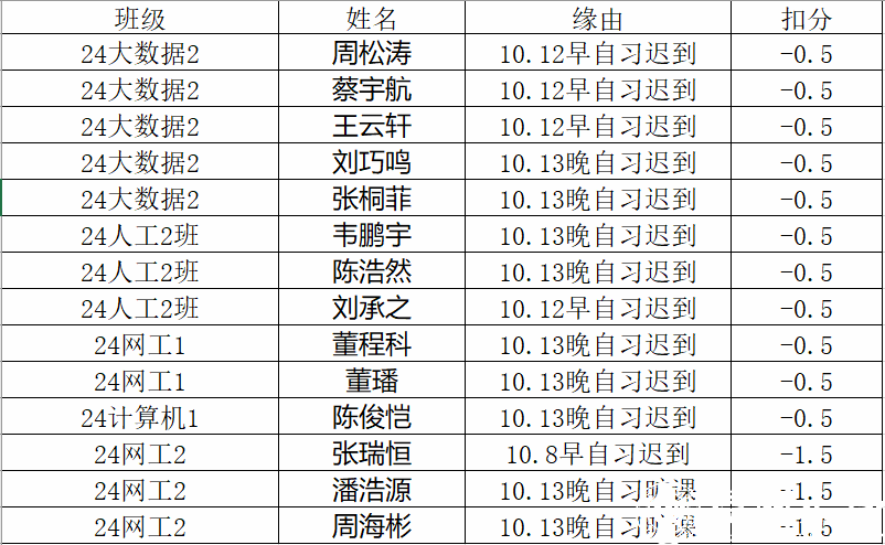 根据《关于组织开展六合彩网站-六合彩资料网站 2024-2025学年第一学期晚自习的通知》,旷课一节扣文明品行分1.5分,缺课一节扣0.5分(三次迟到或早退作一节旷课,生病住院等情况除外);学业指导部将于每周五晚公布本周考勤结果,如对考勤结果有异议请于周日17:00前反馈给学业指导部,六合彩网站 学生科于次周周一进行审核,周二公布,过时反馈无效。 注:1.大学生文明品行分是我校本专科全日制在校生的必修课,六个学期合格记为1个学分。每学期基础合格分为80分,低于80分需要参加志愿者服务时长进行弥补。得分计入相应学期的学生综合素质测评中的德育基础分,纳入学生奖学金评定和入党评价体系。