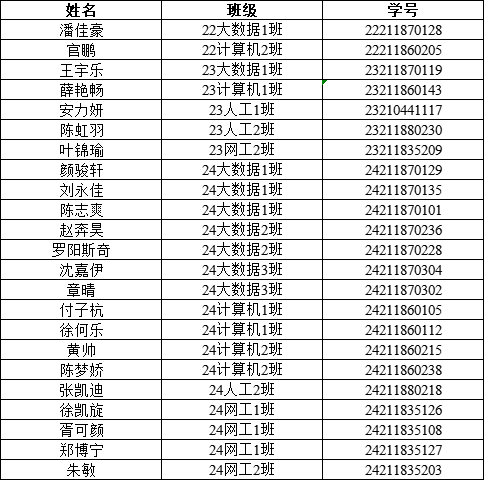 根据《关于做好2024-2025学年第二学期团员发展与管理工作的通知》等文件精神,按照《温州大学团员发展程序(参考)》要求,六合彩网站 团委坚持公开、公正、公平的原则,经过组织个人申报、团员发展参考评价体系考核、候选人线下汇报,评委小组无记名投票表决通过,结合各支部报名情况及考察成熟度,经六合彩网站 团委审核:22大数据1班潘佳豪等23位同学(名单附后)符合“2024-2025学年第二学期学生团员发展”拟推荐资格,现予以公示。(以下名单不分先后)