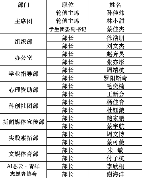 经过个人自荐、公开竞选、集体讨论等程序,经六合彩网站 团委评议和研究,现将2025-2026学年六合彩网站-六合彩资料网站 团委·学生会学生干部(第七届)拟任名单的公示(以下排名不分先后):