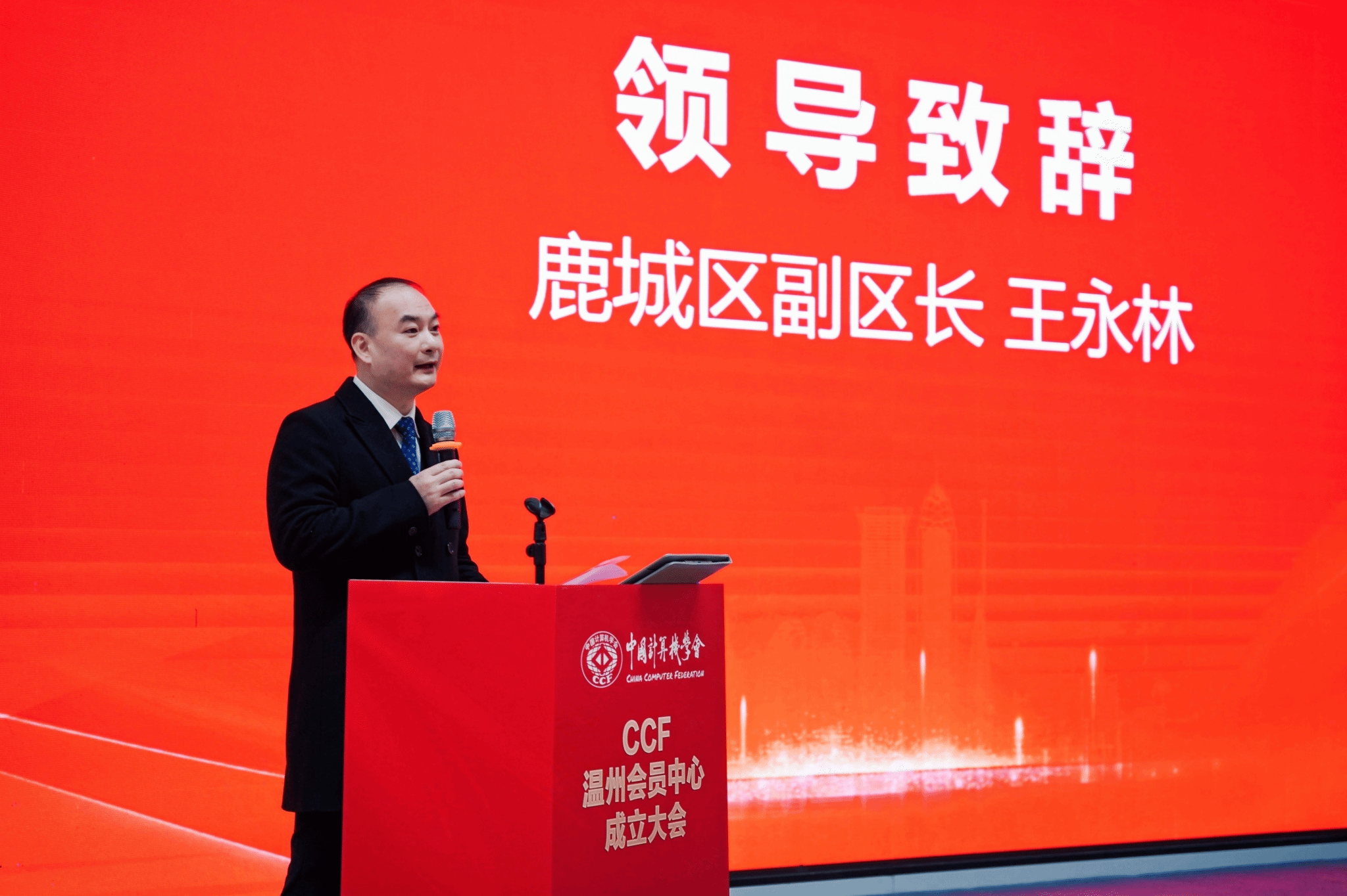 温州市鹿城区人民政府副区长王永林发表讲话,他强调CCF温州的成立不仅为温州地区的计算机科学爱好者提供了一个交流与学习的平台,更是推动温州科技创新、人才培养的重要举措;温州市大力实施数字经济创新提质“一号发展工程”,鹿城区是温州市数字经济集聚核心区,他寄望通过CCF温州的成立,为温州地区的计算机科学研究和应用发展注入新的活力,促进产学研合作,推动科技成果转化。我们深知计算机科学在当今社会的重要性,也认识到培养计算机科学人才对于我们地区发展的重要性。因此,我们将一如既往地支持CCF温州会员中心的工作,为其提供必要的支持和保障。