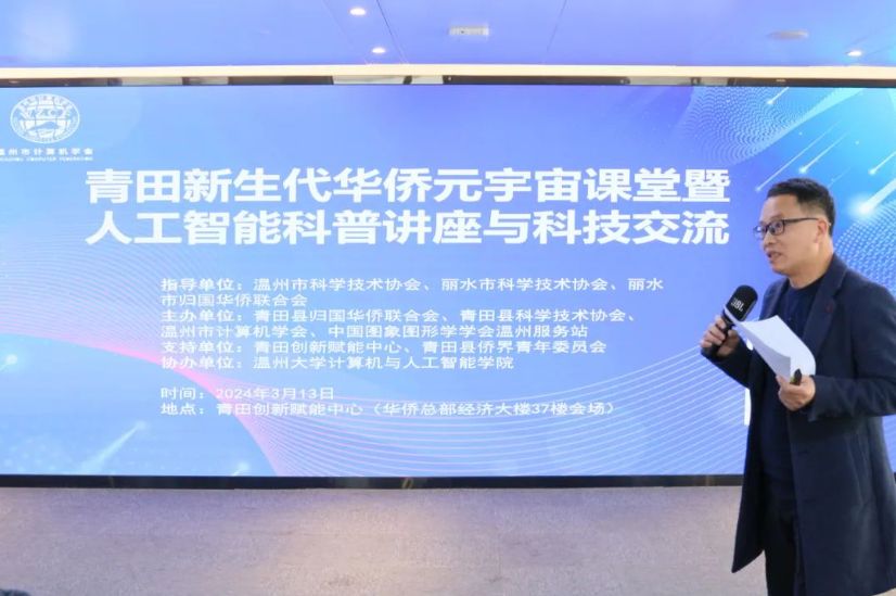 3月13日,由青田县归国华侨联合会、青田县科学技术协会、温州市计算机学会联合举办的青田新生代华侨元宇宙课堂暨人工智能科普讲座与科技交流活动在青田华侨总部经济大楼举行。县侨联党组书记、主席叶娟,县科协党组成员、副主席陈林海等出席会议并致辞,温州市计算机学会副理事长、温州大学大数据专业负责人黄长城教授主持会议。全县四十多名华侨新生代、侨资企业代表参加。