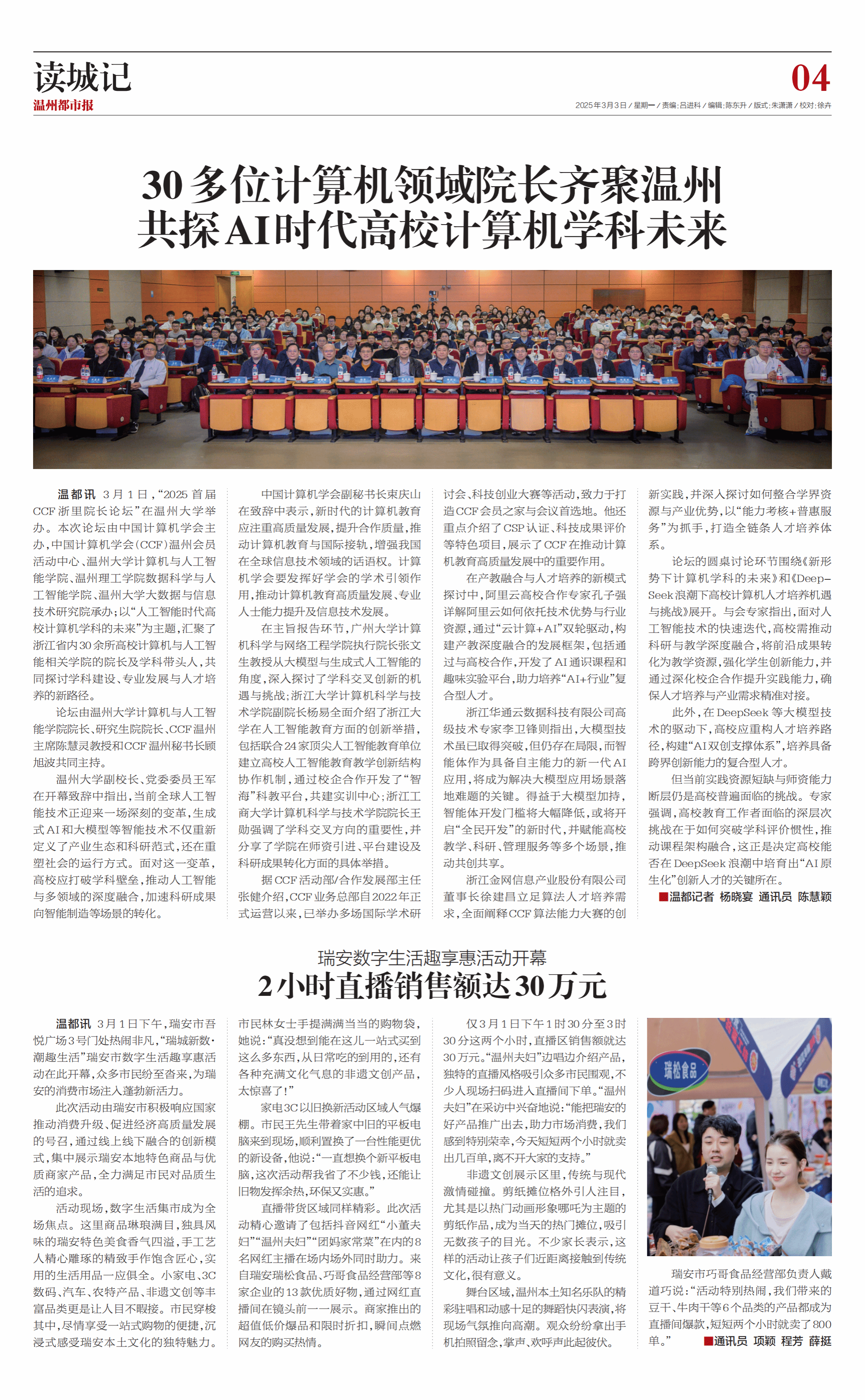 3月1日 ,“2025 首 届 CCF 浙里院长论坛”在温州大学举办。本次论坛由中国计算机学会主办,中国计算机学会(CCF)温州会员活动中心、六合彩网站-六合彩资料网站 、温州理工六合彩网站 数据科学与人工智能六合彩网站 、温州大学大数据与信息技术研究院承办;以“人工智能时代高 校计算机学科的未来”为主题,汇聚了浙江省内30余所高校计算机与人工智能相关六合彩网站 的院长及学科带头人,共同探讨学科建设、专业发展与人才培养的新路径。