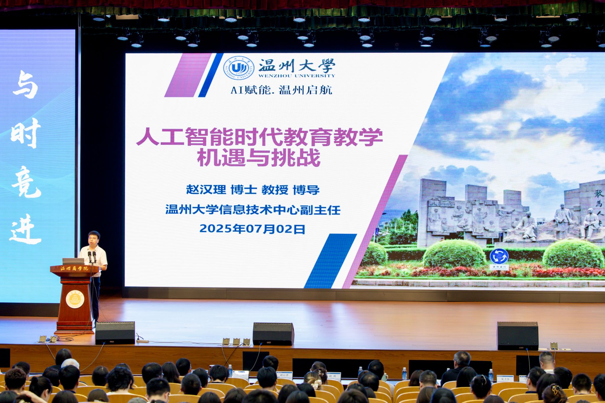 会上,温州大学信息技术中心副主任赵汉理教授以《人工智能时代教育教学机遇与挑战》为题作专题培训讲座。他从人工智能技术现状切入,深入浅出地阐述了AI发展历程与技术原理,全面解读AI给教育领域带来的机遇与挑战,并提供了AI教育教学应用场景的思路与路径。