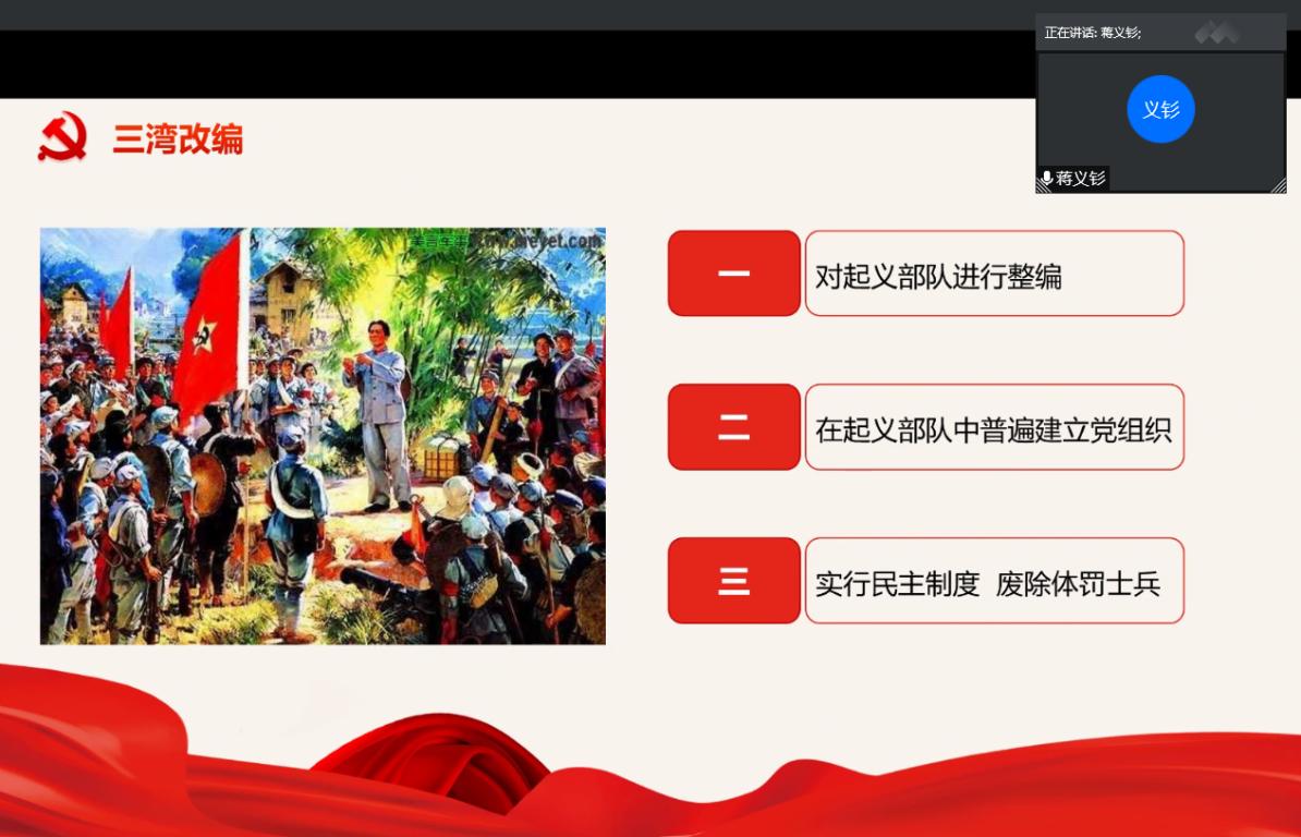 随后,蒋义钐同志围绕大革命失败与中央政策转变、南昌起义的酝酿决策、南昌起义概况、起义部队南下失利、朱德保存革命火种等方面与党员共同回顾学习了那段红色历史。他详细讲解了在敌强我弱的不利局势下,毛泽东同志以无产阶级革命家的胆略与气魄,审时度势、勇创新路,提出“文家市转兵”的决策,最先开始了中国革命工作重心的转移,成为共产党人独立自主探索“农村包围城市、武装夺取政权”的中国革命道路的光辉起点;毛泽东同志领导“三湾改编”,从政治上、组织上保证了党对军队的绝对领导,是我党建设新型人民军队最早的一次成功探索和实践,标志着毛泽东建设人民军队思想开始形成,使得同志们对这段历史的理解更为深刻。