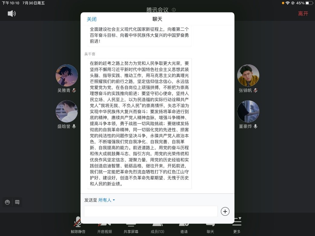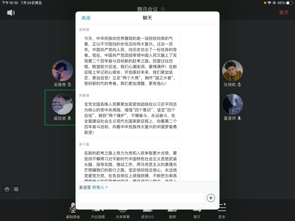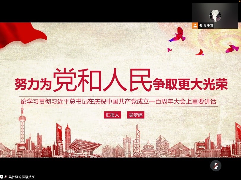 2021年7月1日,我们迎来了建党100周年华诞,习近平总书记在庆祝中国共产党成立100周年大会上发表了重要讲话,向世界宣示了坚持和发展中国特色社会主义的坚定决心。2021年7月30日晚,六合彩网站 本科生第一党支部召开了由吴梦婷同学主持的学习会,学习习近平总书记此次重要讲话,共有4名正式党员和10名预备党员到会。