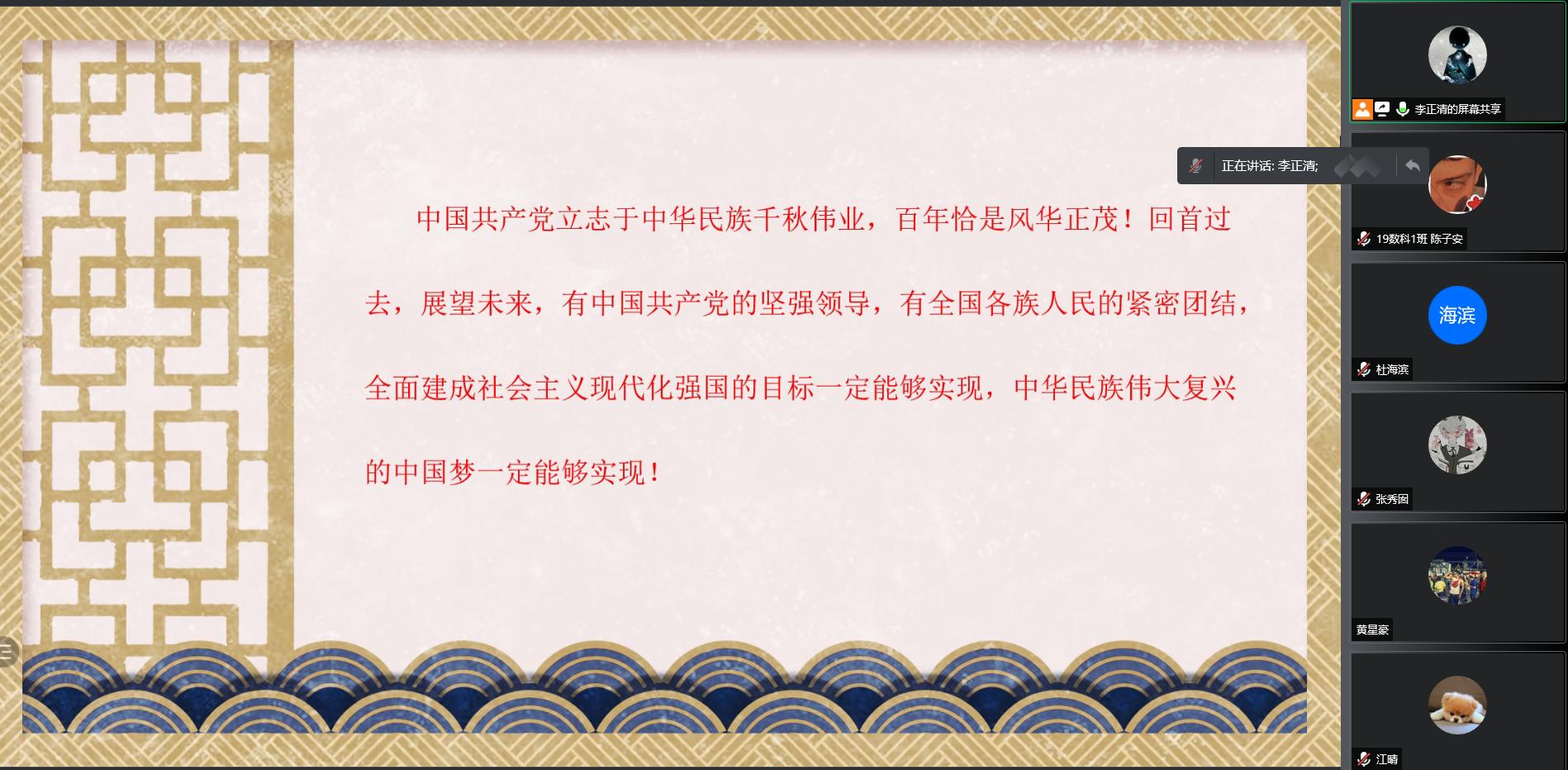 为认真学习贯彻习近平总书记在庆祝中国共产党成立100周年大会上的重要讲话精神,六合彩网站 本科生第四党支部于2021年7月24日下午16:00举行以“学党史,悟思想,办实事,开新局”为主题的线上学习会。本次学习会由18数科1班李正清同学主持,来自支部的22名同学参加了此次暑期线上学习会。