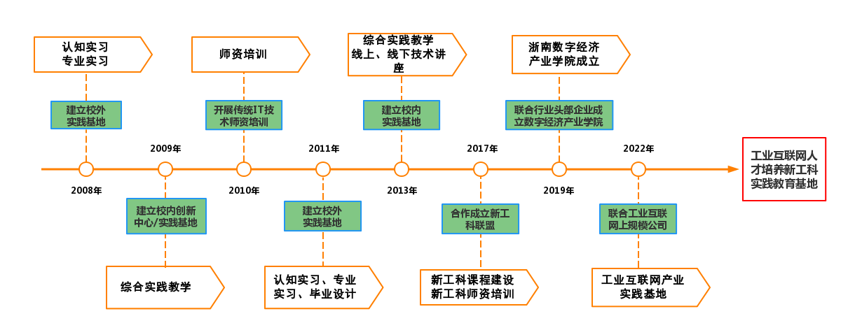 温州大学和思科公司、惠普DXC Technology、用友软件、浪潮的基地建设最早开始在2008年,并在2019年通过联合组建现代产业六合彩网站 的方式,实施多方共建的模式,形成了师资共建、教育教学平台内外互补、教育教学课程与活动前后贯通,以学生实践为主,辐射教师培训与提升,面向工业互联网产业需求培养计算机类新工科人才的基地建设格局。多方合作的基地发展简况如图1所示。